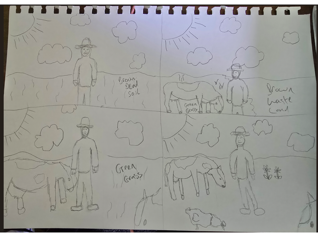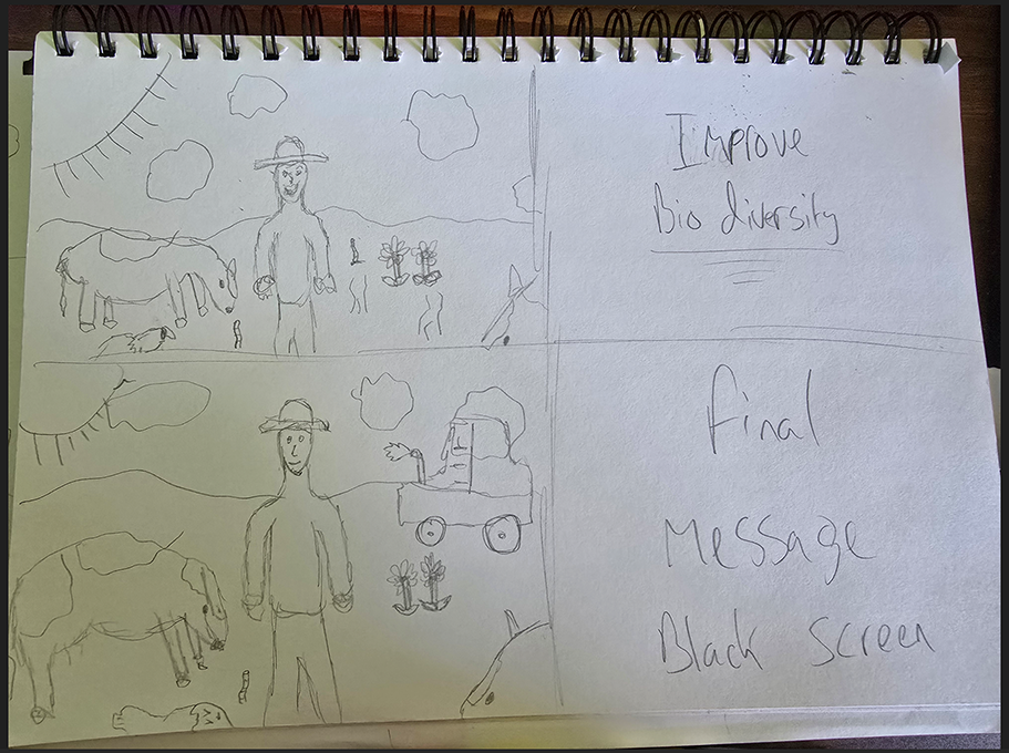 The final storyboard reflects these choices and constraints. The animation features elements that “pop” into the frame with minor movements, adding a sense of liveliness while keeping the process manageable. The sequence begins with the farmer (representing humanity) entering a barren, lifeless field. The farmer introduces livestock—cows and other ruminant animals—as symbols of regenerative farming. With their arrival, the soil visually transforms, changing from dry and exhausted to vibrant and fertile. Flowers bloom, insects return, and colour floods the screen, reinforcing the theme of environmental restoration.