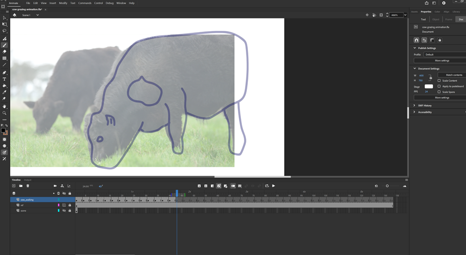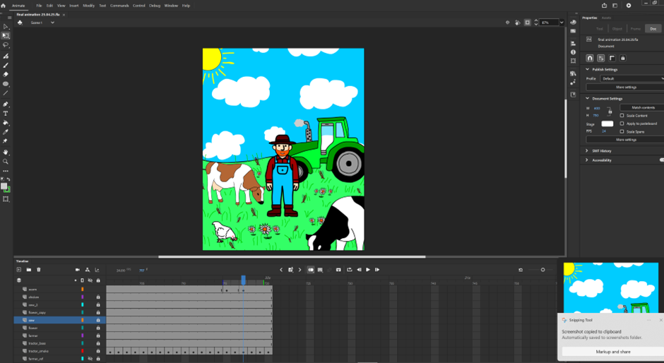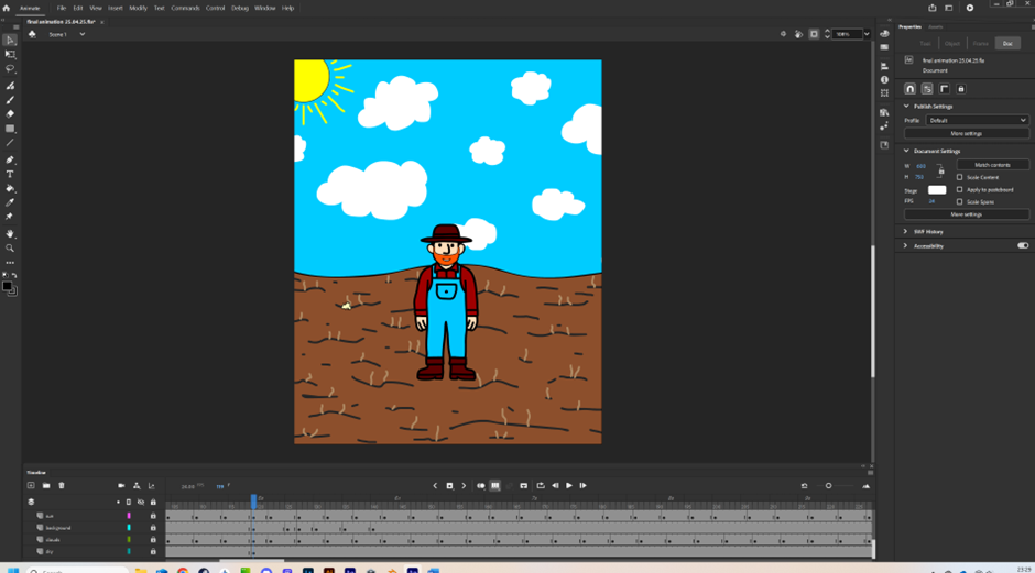 Initially, I envisioned creating a stop-frame animation using printed drawings of the main characters, such as a farmer and a cow. My idea was to illustrate each frame by hand, print the individual assets, cut them out, and animate them through sequential photography. However, once I began the production process, I found myself without access to a printer. This limitation forced me to rethink my approach.