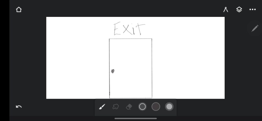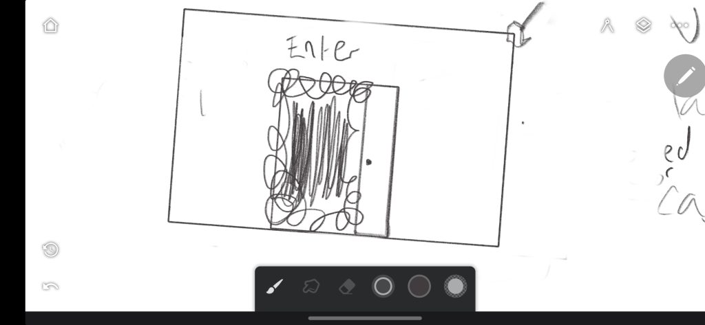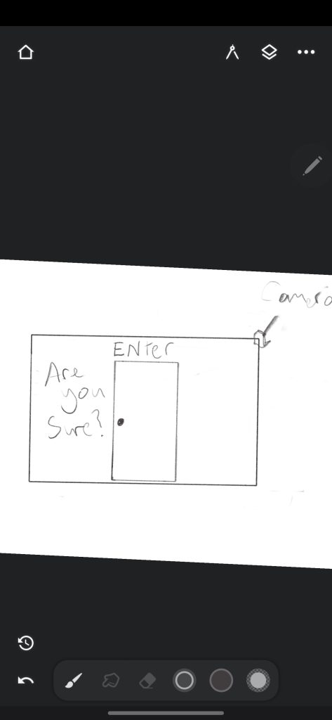 The next frame shows the user noticing a black door in the distance. It moves slightly, and a faint low hum leaks through. The contrast of black against white immediately draws attention and symbolises the hidden chaos beneath surface calm. The door represents the boundary between order and distraction an ever-present tension within the ADHD mind. The storyboard highlights the shift in light and sound as the user approaches the door: ambient tones become louder, and the lighting gradually darkens. This creates both curiosity and unease, leading to the next stage of the experience.