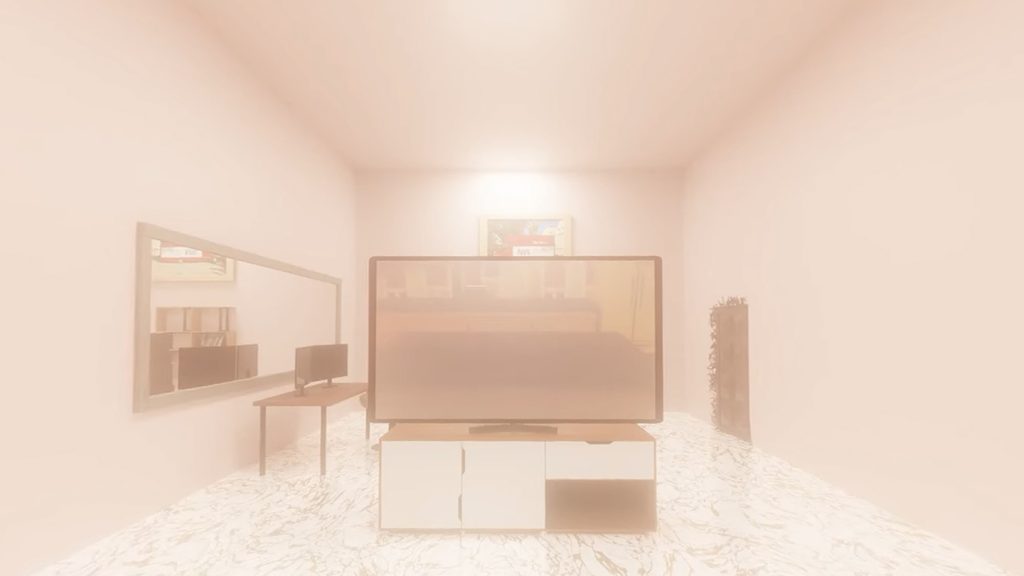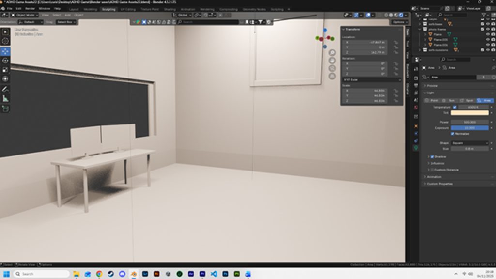 The narrative structure of this project is built entirely around contrast. It represents what many people with ADHD want: a simple, quiet life where they are organised, motivated, and not seen as a burden to others. This desire for calm and control informed the design of the first environment, which was intentionally created to resemble a normal, comfortable living space. The room includes familiar and personal items such as a couch with a blanket, a television on its stand, a computer desk for work, and a large framed image symbolising personal achievement. A vinyl player and speaker were added to reinforce the idea of calm through music. Soft lighting, neutral colours, and a large window allowing natural light were used to enhance this atmosphere. This environment functions as a control variable, allowing the viewer to establish a sense of stability, comfort, and normality. It represents the mental state I aim to be in, where tasks feel manageable and life feels structured.