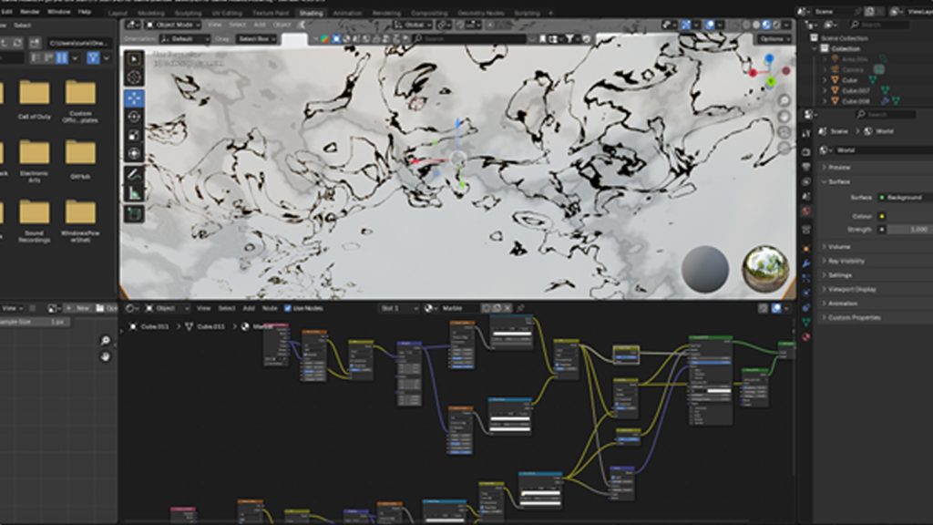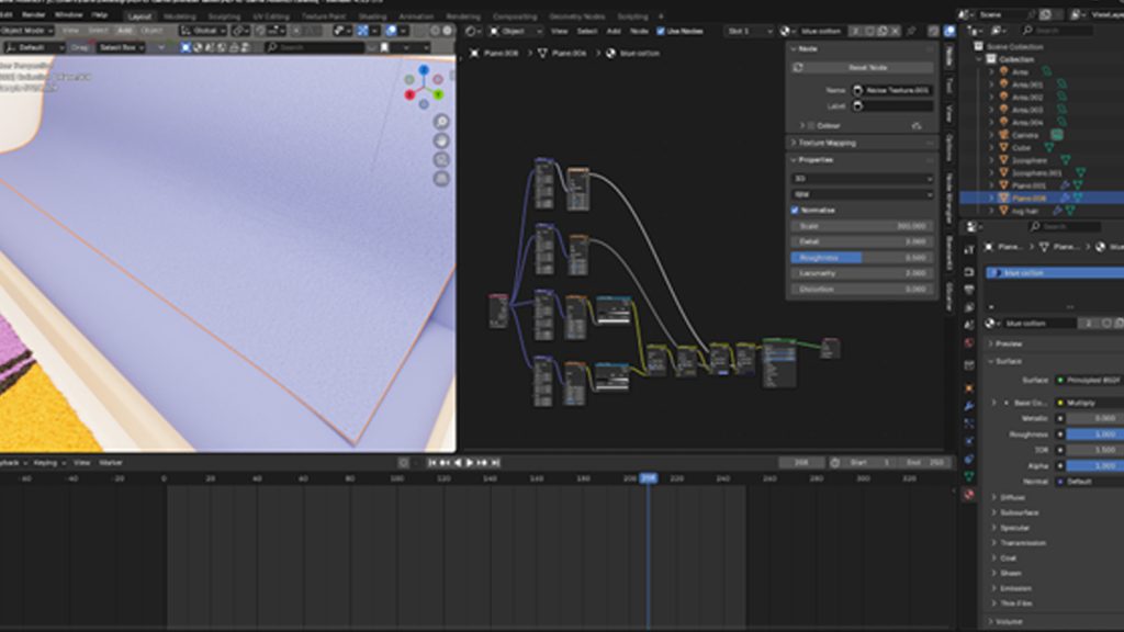 All textures were created procedurally using shader nodes and geometry nodes. Wooden objects shared a base texture but were individually adjusted to avoid repetition and to create variation between assets. Cloth simulation was used for elements such as the blanket on the couch, utilising both active and passive physics, followed by light sculpting to achieve a natural resting position.