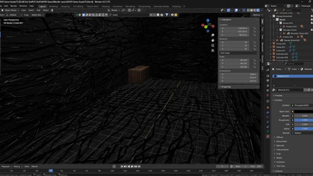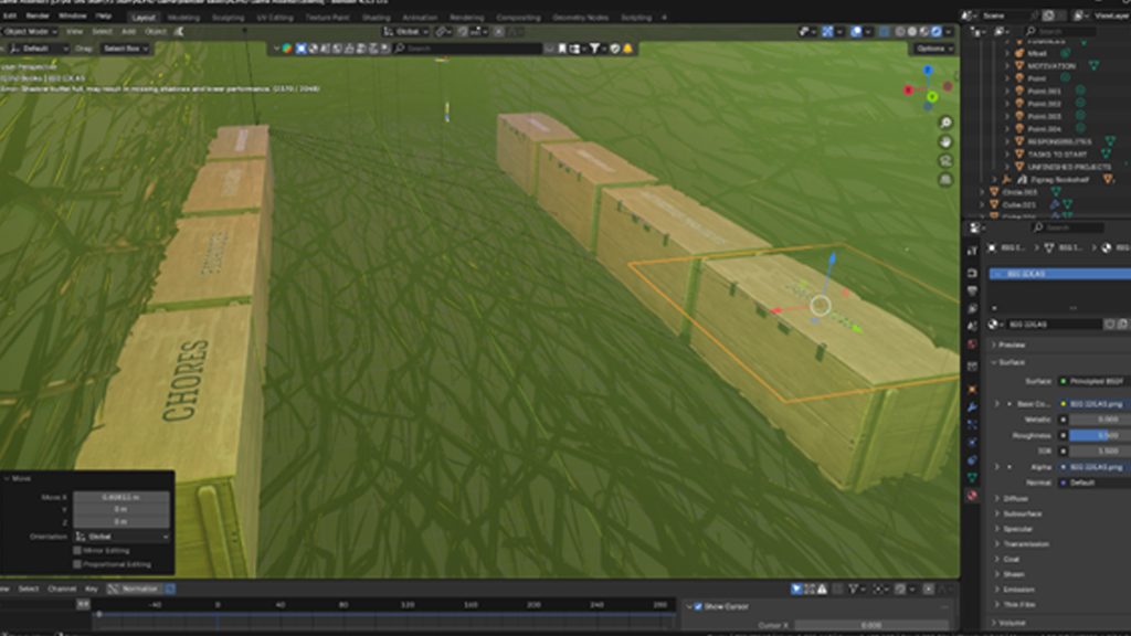 Blender was used for all 3D modelling, texturing, animation, lighting, and rendering within this project. Adobe Illustrator was used to create the text labels for the chests, as adding text geometry directly in Blender would have significantly increased the polygon count. At this stage, the scene was already approaching one million polygons, so this decision was made to optimise performance.