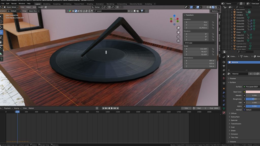 All objects within the scene were modelled from scratch, which explains the initially high polygon count. At its peak, the scene exceeded 4.5 million polygons. To resolve this, extensive use of the Decimate modifier was required, reducing the final scene to approximately 970,000 polygons. This optimisation significantly improved viewport performance and rendering times.