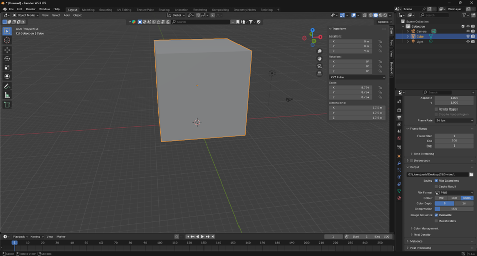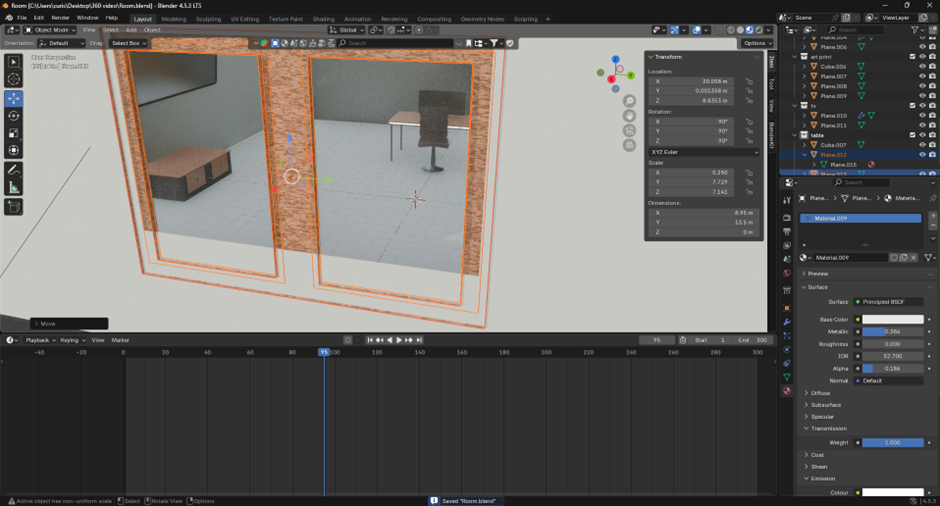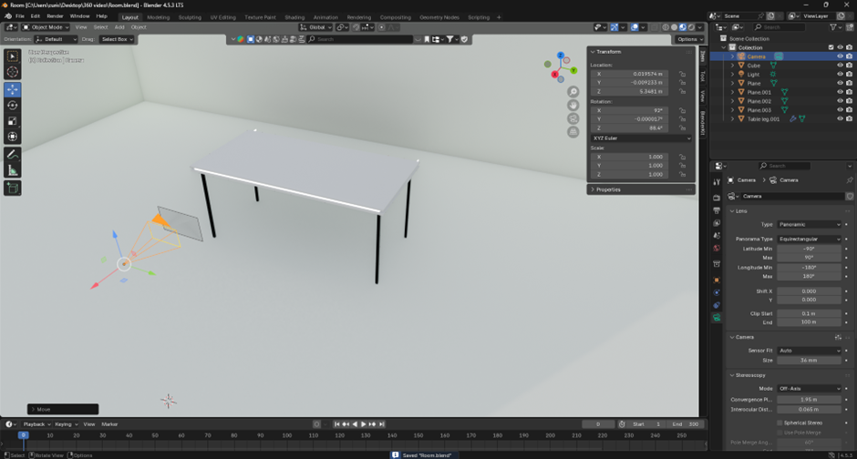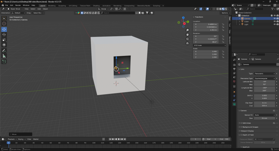 Placing the 360° camera was a deliberate process. I positioned it at eye level between the desk and the seating area, giving viewers a natural first-person perspective that encouraged exploration of the environment. While exporting, I encountered a few technical challenges. The video initially rendered with the wrong aspect ratio, causing YouTube to upload it as a Short instead of a full 360° video. After researching proper export settings and aspect ratios, I corrected the issue, which was an important learning experience in understanding how 360° media is formatted and published online.