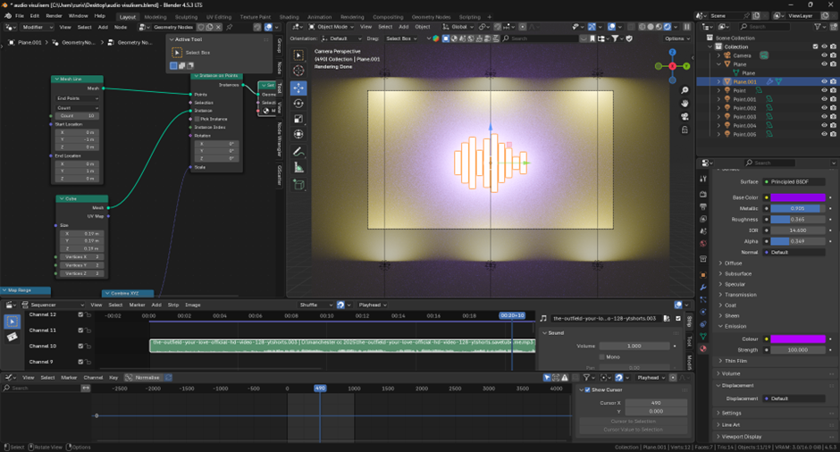 Alongside this, I experimented with an audio visualiser concept using Geometry Nodes. This project allowed me to explore how light, sound, and motion can interact within a 3D environment. I began with a simple geometric form and added emissive materials to create a glowing effect that pulsed in rhythm. Initially, the emission was too strong and overpowered the edges of the object, so I refined it by introducing both front and back lighting. Adjusting the light intensity and colour balance, combining purple and yellow as complementary tones gave the scene a richer, more dynamic visual identity. These small experiments reinforced how crucial lighting and contrast are in shaping the viewer’s emotional response inside VR.
