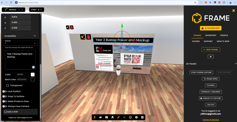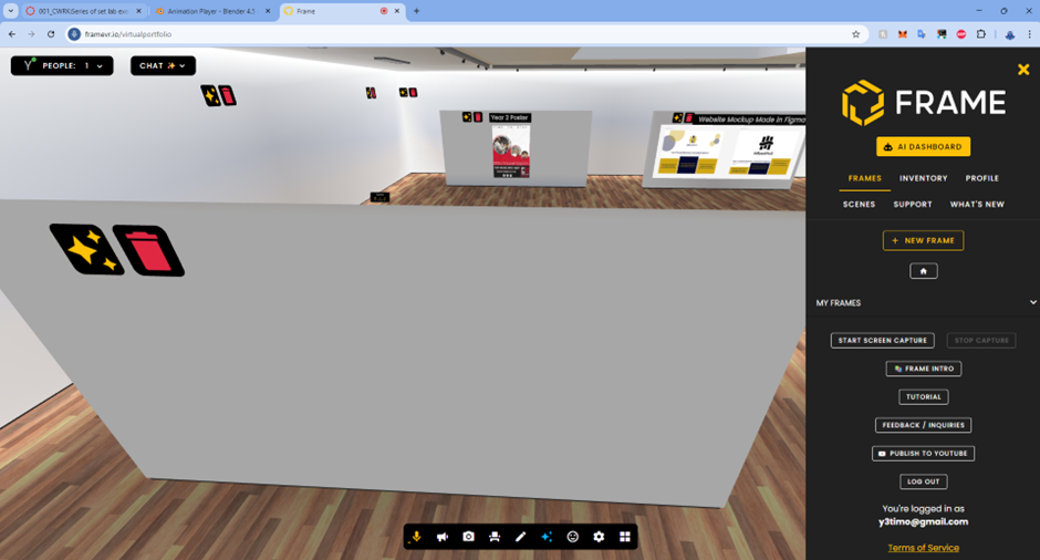 Finally, I used FrameVR to create a modern-style virtual gallery. I placed work from my first and second years of study across the walls to illustrate my artistic development. This digital gallery added a new layer of interactivity and spatial storytelling, as viewers could walk through the space and engage with my portfolio in a more immersive way. I realised that a WebVR environment like this could be a powerful tool for showcasing personal or professional work. It combines accessibility with atmosphere, allowing anyone with a browser or headset to experience a portfolio as a spatial journey rather than a static slideshow.
