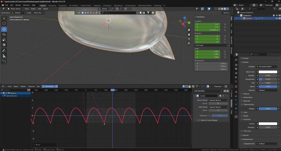 Visually, I chose a soft, reflective material for the bubble and a rounded balloon-style 3D text to make it feel friendly and lightweight. The text gently fades out before changing to a new word, which helps to maintain a smooth, calm rhythm for the user. These small choices were guided by user experience (UX) principles; especially clarity, accessibility, and visual hierarchy. The user should be able to understand what’s happening instantly without any instructions. Using motion and material design helps to communicate this intuitively, creating a feeling of continuity and flow that keeps the experience pleasant and engaging rather than chaotic or confusing.