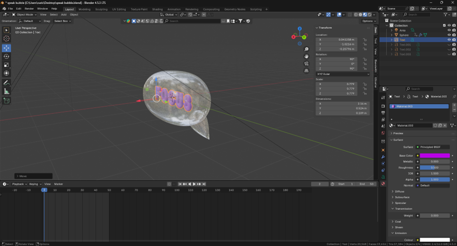 The speech bubble model was originally created and animated in Blender, then exported into 8th Wall as a .glb file. Within 8th Wall, I set up a basic scene where users could tap their screen to trigger the bubble to appear, move, and change its displayed word. Each tap generates a new “thought”, allowing the bubble to become a metaphor for an active, changing mind. This interaction makes use of 8th Wall’s event system, where simple JavaScript functions can control when and how 3D objects respond to user input. In this case, the tap interaction symbolises the user sparking a new idea, while the floating animation represents the transient nature of thoughts.