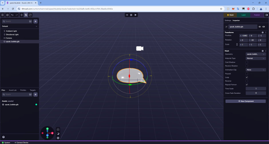 I started by following the introductory tutorial for 8th Wall, which helped me understand how augmented reality can be used to merge digital elements with physical space. This first exercise gave me valuable insight into how 3D assets behave in AR environments and how user interactions such as tapping, scanning, or moving the camera influence the experience. From this foundation, I began developing a small personal project that connects to one of my other ongoing assignments. My idea was to create an interactive speech bubble that floats and bounces within the user’s real-world environment. The concept was inspired by the idea of thought and communication; the bubble acts as a visual representation of internal dialogue and shifting focus.