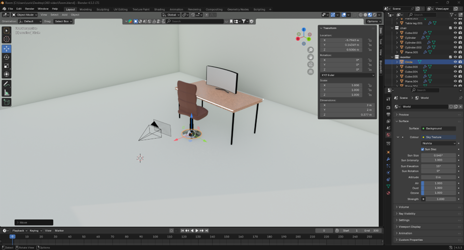 I began by modelling an office desk with a monitor surrounded by a soft lighting bar to give the impression of subtle technological ambience. From memory, I created a computer chair and used Geometry Nodes to develop a detailed leather texture that responded to light naturally. I then modelled a large window, applying a transparent glass material and adding a sky texture so that, when rendered, it appeared as a bright, sunny day. This small touch immediately transformed the atmosphere of the room, introducing warmth and realism.