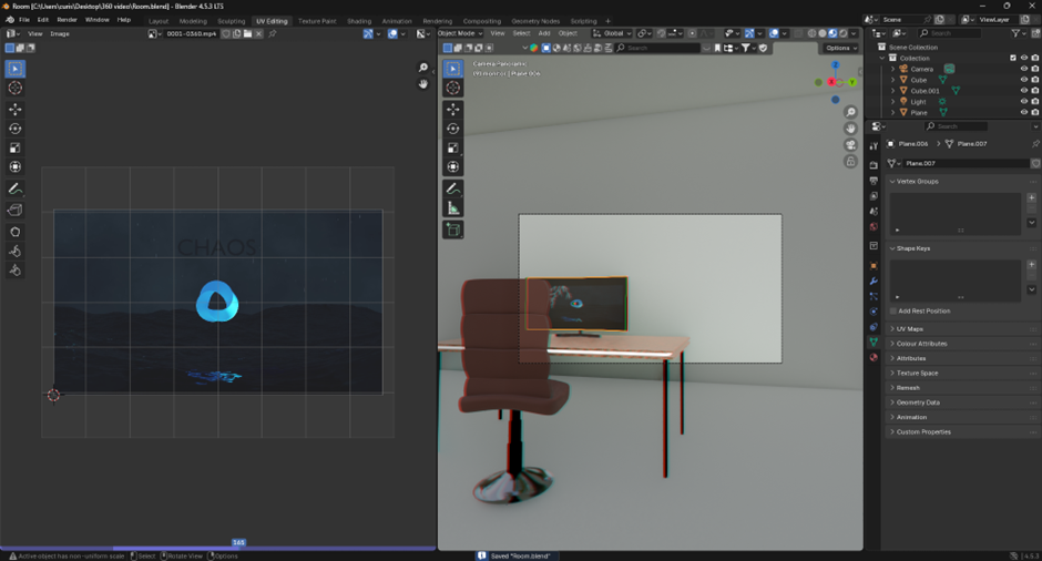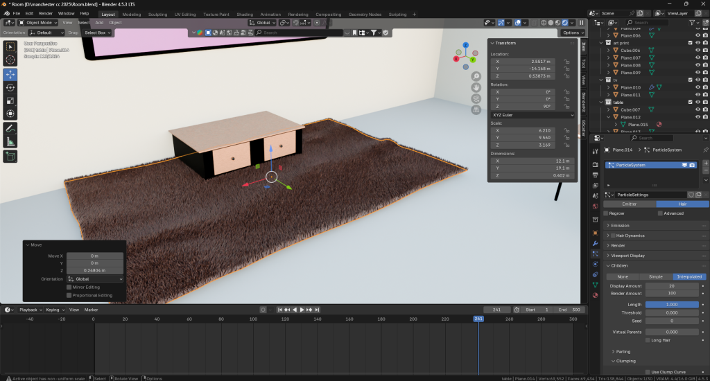 To bring additional depth to the space, I created a white shaggy rug beneath the table using Blender’s hair particle system, which gave the surface a tactile, soft appearance. On the wall, I mounted a flat-screen TV and mapped a looping video I had previously made in After Effects, which cycled through artwork I had designed. I applied a similar technique to the monitor on the desk, embedding another short looping animation I had produced in Blender. These animated elements helped the environment feel alive and gave the illusion that someone had only just stepped away from their workspace.